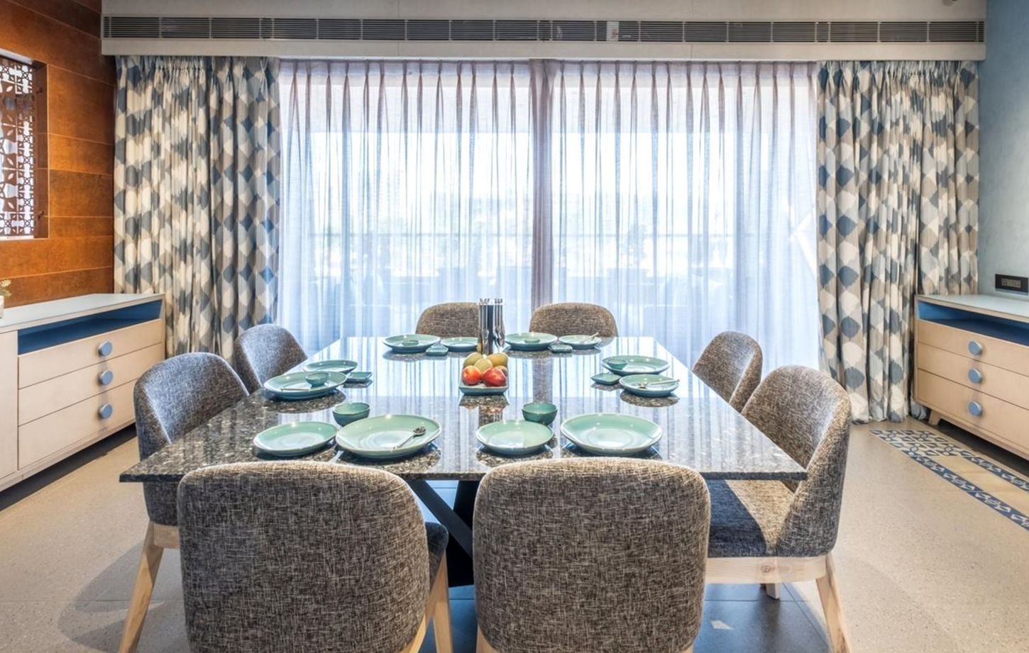 The house derives its ambience aspiration from the very different personalities of Rashmi and Kapil - the young dynamic couple who own the house. While Rashmi is a very outgoing and creative jewellery designer, Kapil brings the calming and soothing feel to the relationship and the family. The spaces in the entire house are in shades of grey, be it the flooring or the walls, and they are very well interspersed with very contemporary patterns and motifs and colours coming through a variety of elements like flooring and screens. Unrestricted usage of pastel hues like blue, green, yellow and orange tends to make the house vibrant and lively!