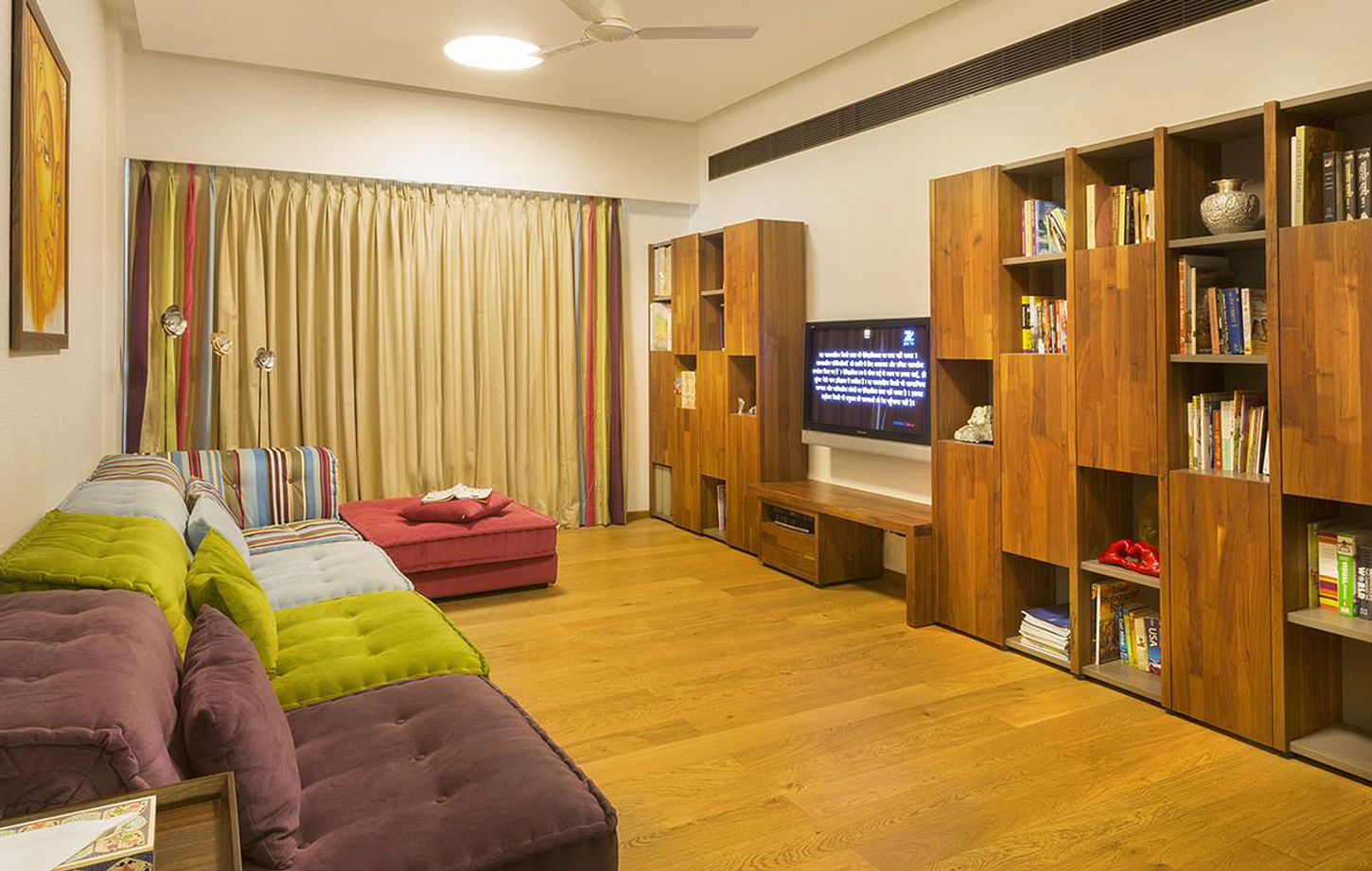 This apartment for a friend, a diamontaire, started with a simple idea of exploring the various kind of stones available in India. The residence is a very modern house with an overlay of Indian character. The values of simplicity and responsible design have been explored to a great extent. The wife, also a painter, has virtually owned up the space converting the house into her art gallery. Her passion has also led to growing of lot of vegetables in their garden in the peripheral planters provided by the developer.